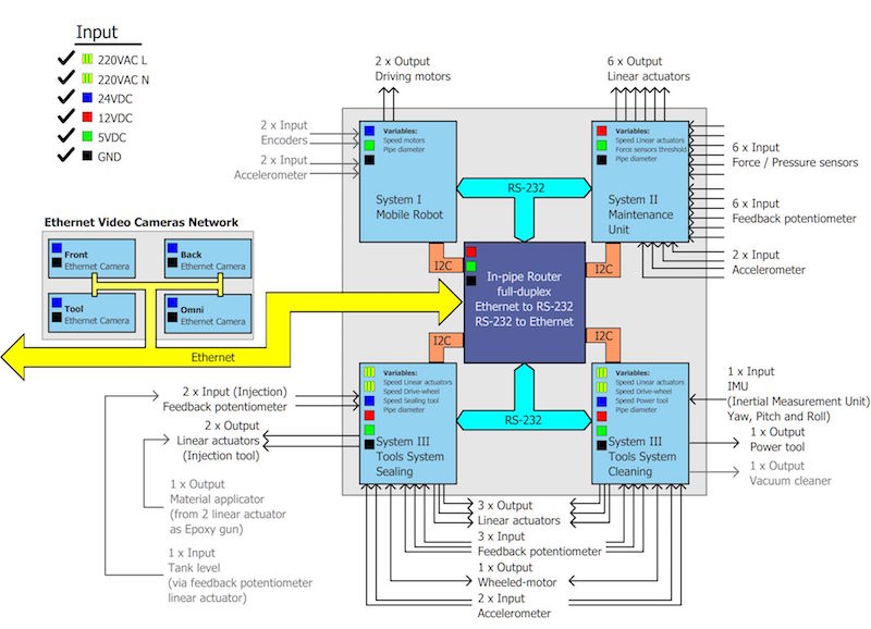 The DeWaLoP communication protocol integrates TCP/IP, RS-232 and I2C over ethernet. In this configuration, peripherals with different communication protocols are unified to a single channel. TCP/IP over ethernet is used for the long distance data link, transmitting remote control commands, sensors values, video streams and actuators status between the in-pipe robot and the remote controller. While the communication between the robot systems, as well as inside the remote controller is made with micro-controllers serial interfaces such as SPI / RS-232 / I2C. In this way, the cores communicate efficiently in their native protocols, enabling the use of simultaneous parallel lines for data processing, [Mateos et al., 2011].