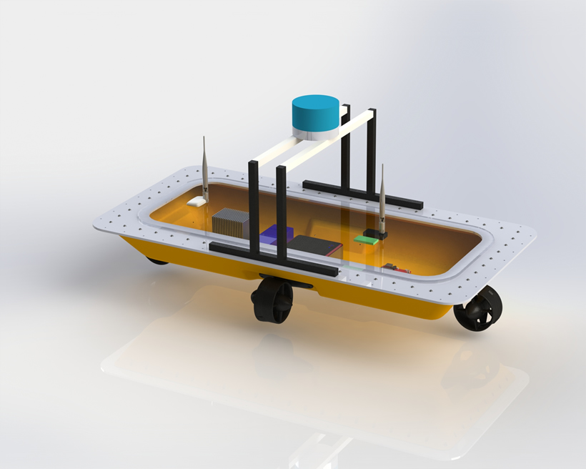 Roboat with lidar for perception and navigation 3D model (left). Guiding system based on lidar ±100mm (right).