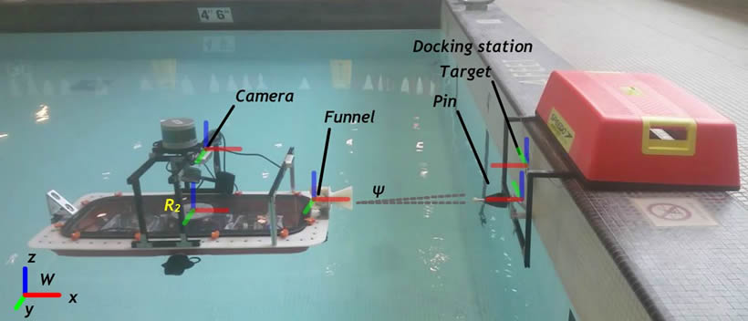 The roboat R navigates from one corner of the swimming pool to face the docking station and then activates the latching guiding controller to perform latching, this is the camera-tag visual servoing. The light reflections creates a challenging situation for the guiding algorithm, since it’s required to adapt its position and orientation overcoming the noisy environment.