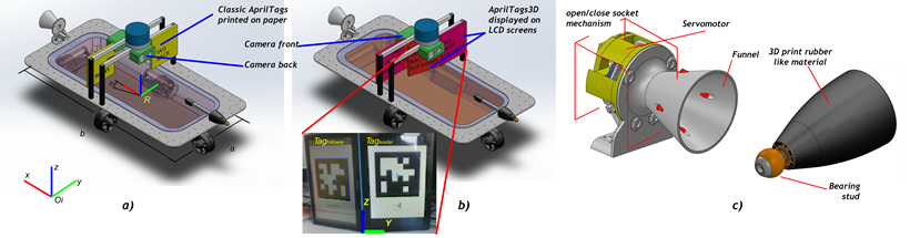 The autonomous latching system enables robotic boats to latch each other secure and efficient. It is based on the spherical joint (ball and socket) that allows rotation and free movements in two planes at the same time. It consists of two parts: the male part that includes a bearing stud on the front-edge, and the female part, which integrates a funnel to guide the male ball into an actuated receptor that traps the ball, creating the spherical joint between the boats. In this configuration, the latching system is capable of securely and efficiently assembly/disassembly floating structures. Each roboat includes both the male and female connectors and thus integrates cameras and tags aboard. In this way, the roboat can be fully connected, one roboat can be connected by others on the front, back, left and right side. The autonomous latching system guides the boats with a camera – tag logic. The camera is located on the boat that wants to latch, while the tag is located on the target boat. Each roboat integrates 6 connectors, 4 cameras and 4 tags to be fully connectable.