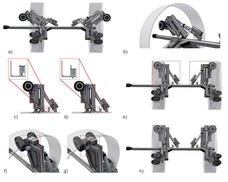 For the LaMMos mechanism evaluation, the DeWaLoP in-pipe robot was modified. A couple of its wheeled-legs were modified to include the LaMMos mechanism instead of rigid brackets. The objective is to lower the wheeled-legs so the in-pipe robot is able to enter its minimal working pipe diameter while protecting its legs. And once inside the pipe reconstruct the robot wheeled-legs as original. The acting forces on the legs of the robot may reach 2000N and therefore a latching mechanism with strong stability is required. Moreover, this mechanism offers many interesting opportunities for robotic research in terms of functionality, payload and size.