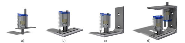 LaMMos mechanism integrated in brackets. a) LaMMos mechanism. b) LaMMos flat-bracket. c) LaMMos right-angle bracket. d) Multiple LaMMos inside a box-bracket.
