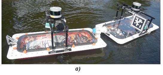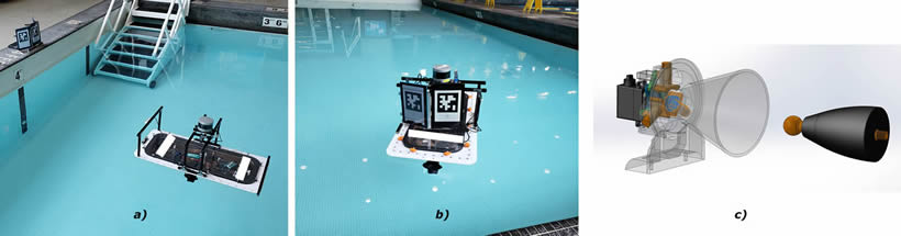 The setup consist of one autonomous robotic boat R1 with a RGB camera and an actuated funnel, R1 is located in a position (R1x , R1y ) in the swimming pool. R1z is dismissed, since the controllable space is defined as a 2D plane on the water (Wx,Wy). A docking station with a squared tag dimension l = 0.13m and a pin for latching is located at (Tx,Ty,Tz). The robot’s camera can detect and calculate the pose of the marker, which is located on the docking station a couple of meters apart. In case, the robot fails to latch due to noise in the pose estimation readings, it executes an autorecovery algorithm to reposition itself to retry the docking action [12]. A successful latching is achieved when dx < 10mm, dy < ±40mm and the yaw angle is < ± 27.5°.