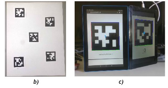 A) Classic AprilTag printed in paper sheet used for pose estimation in autonomous latching with robotic boats. B) Tag bundle setup with five markers for more accurate pose estimation (the markers are set in the same plane). C) AprilTags3D setup with a couple of markers rotated each other. The markers are displayed on LCD screens and are able to change their tagID to indirectly communicate their state to other robots without losing their position and orientation.