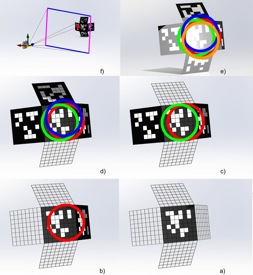 AprilTags 3D. a) Undetectable tag due to direct light reflection. b) Additional tag is detected. c) Tag refines pose. d) Tag improves pose estimation. e) The more the measurement signals become available, the estimation will be more accurate.
