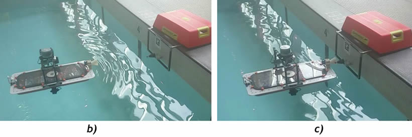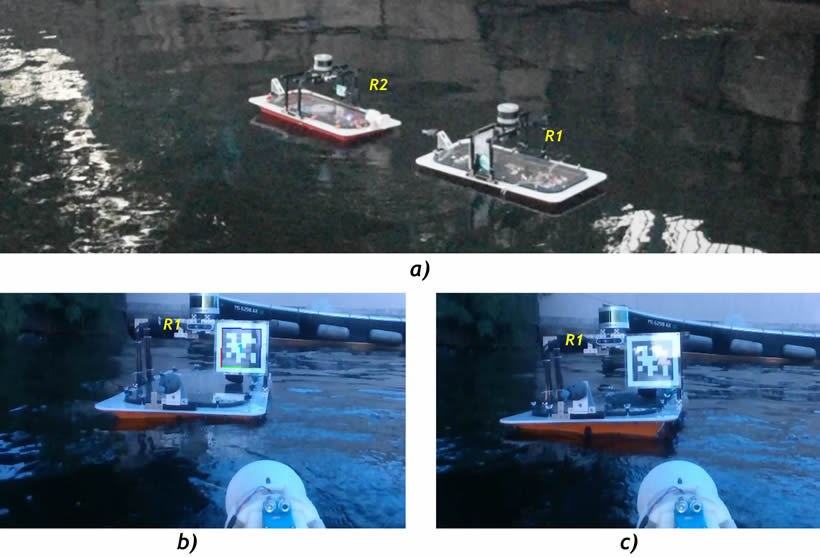 In order to latch the robots, robot R2 is guided by visual cues to a position (x,y). This coordinate must be reach with an error < ±40mm for a successful latching of robot R1. In this challenging task, the robots are not stable on the ground, they are floating on the river, trying to maintain their positions, overcoming waves, wind and water currents. From the camera point of view it is a big challenge to process the 6DOF from the tags located in another boat when it moves with the waves at a degree that the pitch and roll angles vary a few degrees. Further, we are only relying on RGB sensors to perform the latching on the boats. On the river, the main problem with the classic markers was the detection. The marker was detected only 60% of the time, due to the sunlight reflections, see Figure 9. The reason for this low detection rate were the waves, since these created oscillations on both robots, changing their position and inclination, creating multiple random reflections on the tag. In addition, the light reflections from cars on the avenue and boats nearby created an extremely challenging condition for latching the robots. In this real environment R2 required in average five attempts before a successful latching.