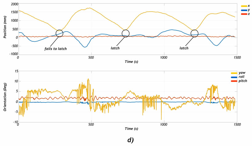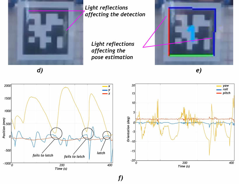 The robot is initially set 1800mm away from the docking station in a direct line, meaning that the only variable to minimize for latching is the distance in the X − axis, dx = 1800mm, dy = 0 with roll, pitch and yaw RPY = 0. In the swimming pool we registered noisy pose estimation, the yaw angle readings varied from 0.1◦ to 10◦. Making the robot to fail when latching, as the robot needed to try a couple of times before a successful latching. Figure 8 shows the experimental setup and the sources of error from the light reflections on the marker.
