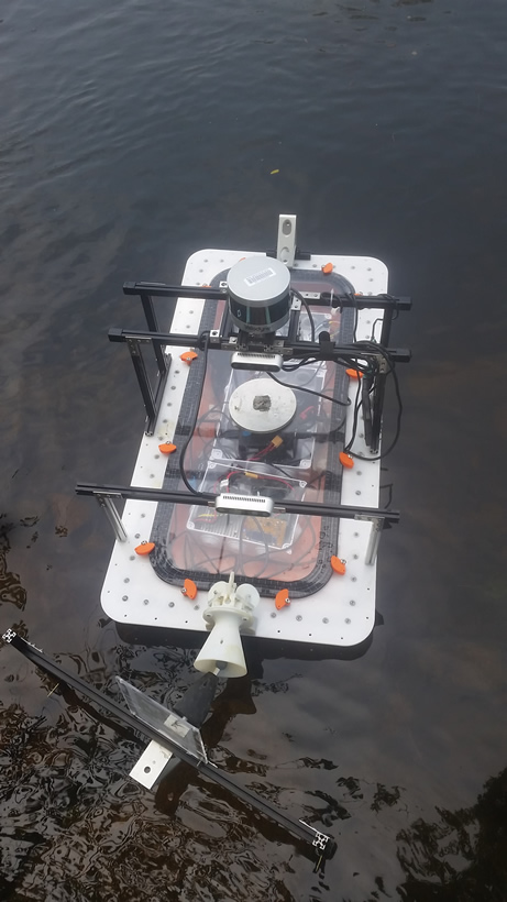 One specific use case of these robotic boats is to tow and guide floating ”dummy” garbage bins in tight spaces. The challenge to perform the towing of these passive-power-less floating platforms is to design an adaptive latching mechanism, able to create a secure connection between the entities, easy to attach/detach, even if the boats are affected by water disturbances. But most important of all, the adaptive latching must be able to restricting the Degrees Of Freedom (DOF) of the latched ”dummy” platform. Since, the robotic boat may drive it in narrow canals as well as on open water.