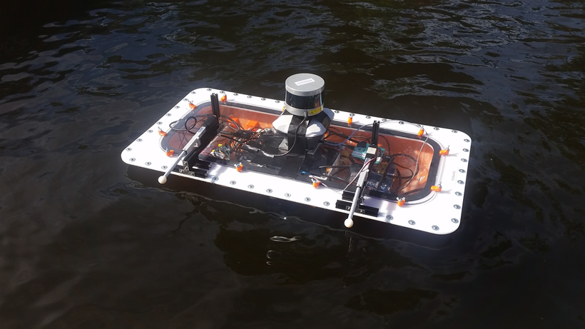 Roboat with lidar for perception and navigation 3D model (left). Guiding system based on lidar ±100mm (right).
