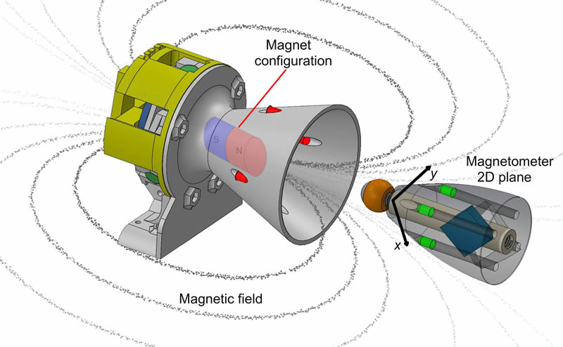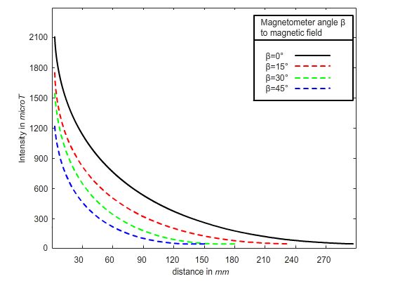 Guiding system based on magnetic field (left). Magnetic field detection by the 3 axis magnetometer in different inclination angles (B=0Deg B=15Deg B=30Deg B=45Deg) (right)