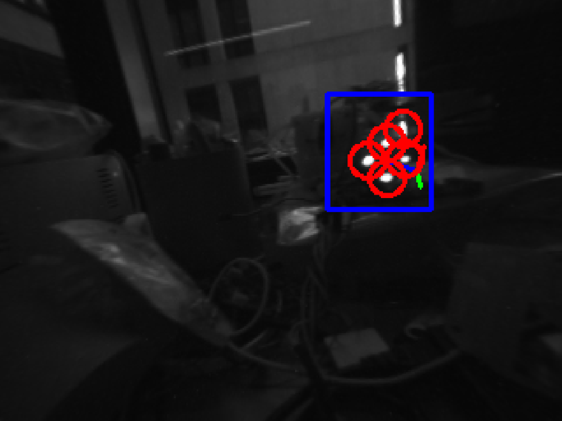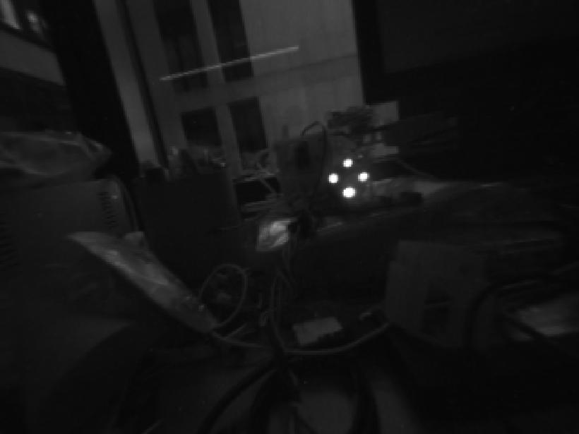 Robustness can be increased if the LEDs are visible from as many view points as possible. Since we are using infrared LEDs whose wavelength matches the infrared-pass filter in the camera, they appear very bright in the image compared to their environment. Thus, a thresholding function is sufficient to detect the LEDs. With at least four LEDs on the target object and the corresponding detections in the camera image, we can compute the 6 DOF pose of the target object with respect to the camera. Our system can also handle more than four LEDs on the target object.
