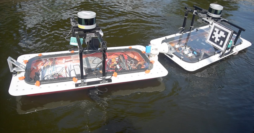 Robotic boats garaging (locking). A roboat can tow a another roboat or a floating "dummy" boat.