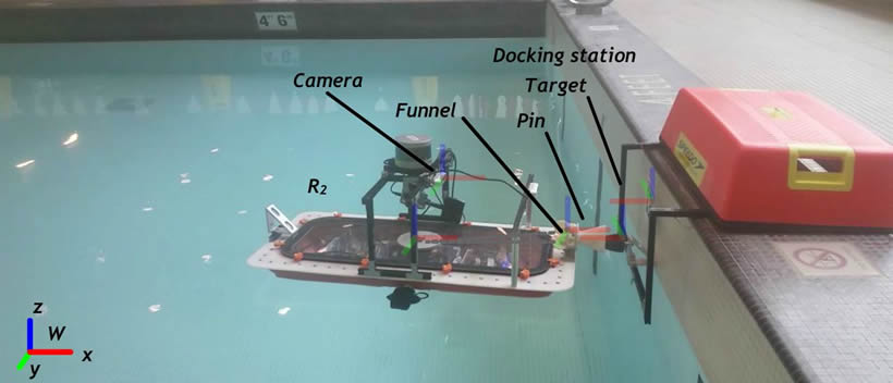 The roboat R navigates from one corner of the swimming pool to face the docking station and then activates the latching guiding controller to perform latching, this is the camera-tag visual servoing. The light reflections creates a challenging situation for the guiding algorithm, since it’s required to adapt its position and orientation overcoming the noisy environment.