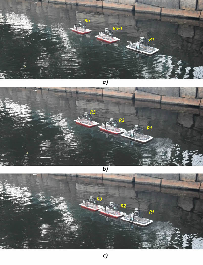 Train link configuration. a) Stand by: roboats spaced 1m. b) R2 latch R1: Tag from R1 tells R2 to latch. b) R3 latch R2: Tag from R2 tells R3 to latch.