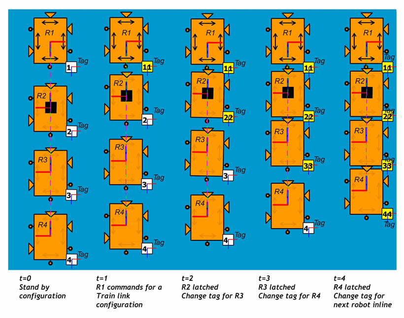 The roboat can see the tag of the previous roboat Rn sees Rn-1 until R1 and are set in stand by configuration, spacing each other 1m waiting for the order from roboat R1. The order is to configure as a train-link, R2 latches R1 and changes its tag to let know R3 that it is latched and the configuration is train-link. R3 latches accordingly and passes the message to the next roboat in line. The train-link configuration is achieved and Rn (in this case R3) changes its tag to let know Rn-1 (in this case R2) that it is latched and progressively R2 changes its tag to let know R1 that the formation has been completed.