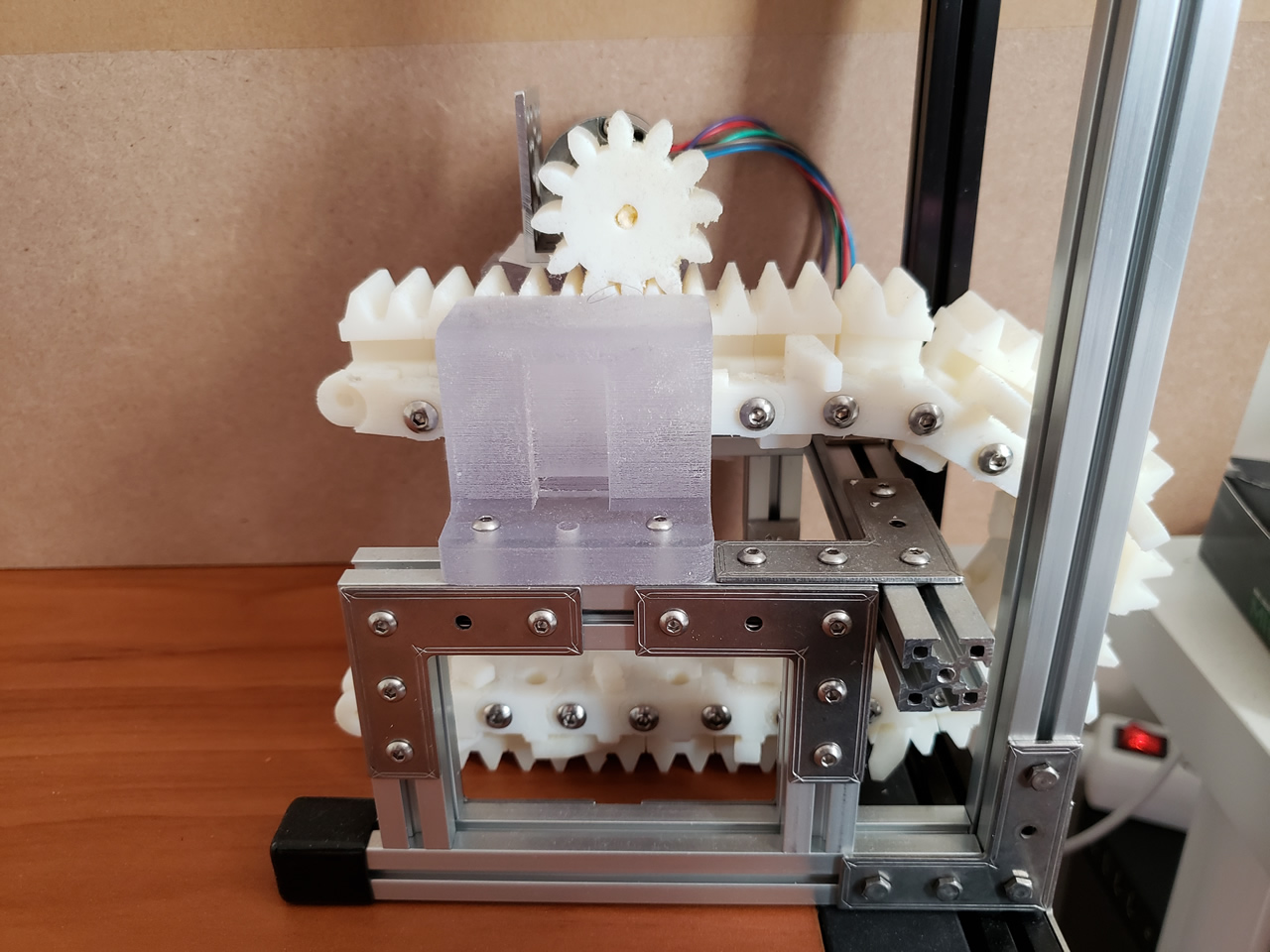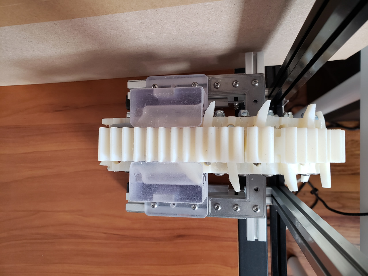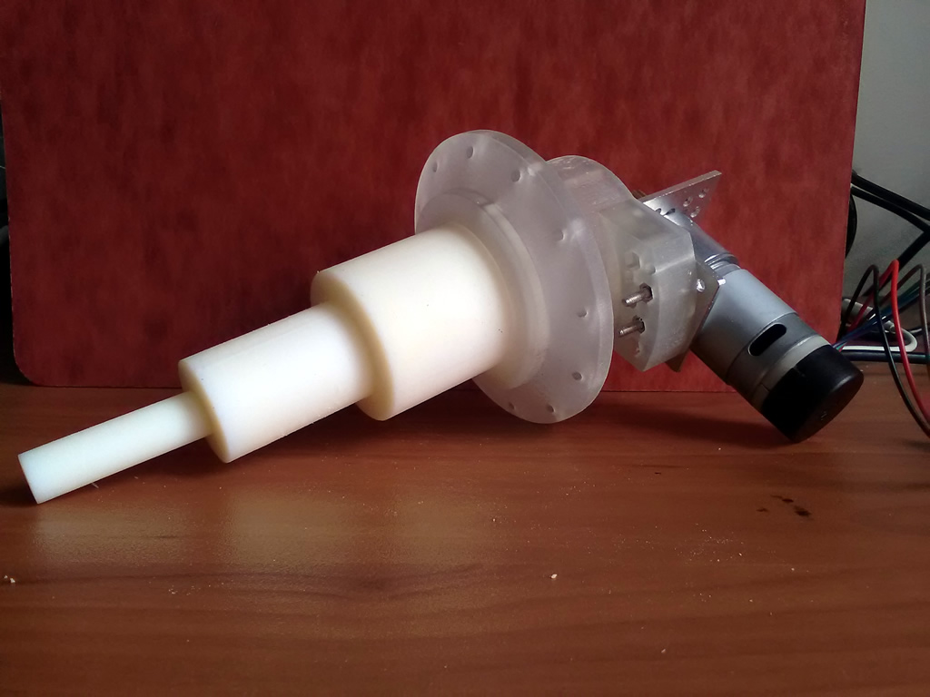 The telescopic actuator integrates a 3D printed rack and metallic pinion gearbox to extend and contract the levels. A geared motor attached to the telescopic’s base level isthe actuation unit ”pinion”, which drives the articulated rack attached to the top level of the telescopic arrangement.