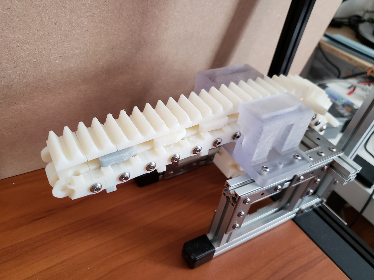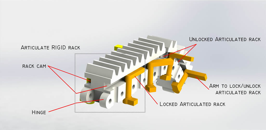 Each articulated rack consists of a couple of gear-teeth, a rack-slot on the sides, a pin with a couple of arms to lock/unlock the articulations and a hinge on both ends for linking the rack articulations.