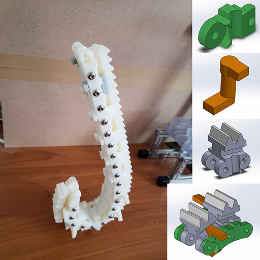 Articulated rackcomponents. 3D printed articulated rack prototype with locked (rigid) and unlocked(foldable) segments. Articulated rack components: Pin cover, cylindrical pin with arms, gear-teeth, 3D model of a couple articulations (right)
