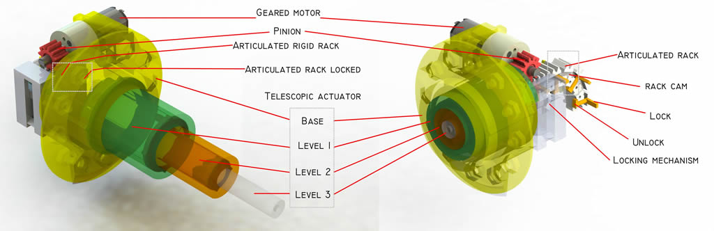 How it works - articulated rigid rack (top). Telescopic actuator with actuation system (bottom).