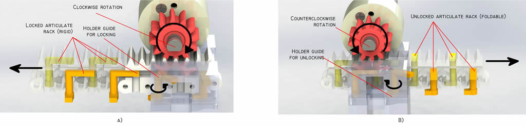 Articulated rack unlocking: If the pinion rotates counterclockwise, it will move the articulated racks inside the actuator, so the guides from the telescopic holder rotates the ARMU and consequently rotating the ARML releasing it from the rack’s slot, changing the articulation properties from rigid to foldable.