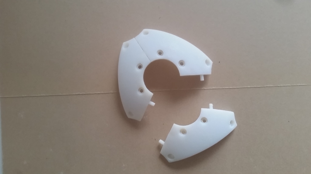 The outer shell covers the sealed spherical robot (inner shell), holds the telescopic actuators (legs) and protects its electronics and motors. In this configuration, there are no wired connections between the sphere and the exoskeleton. The outer shell consists of 24 3D printed parts that forms a sphere. The material used for printing the outer shell is a mix of 3D print-material RGD450 and FLEX, which is a rigid material and flexible.