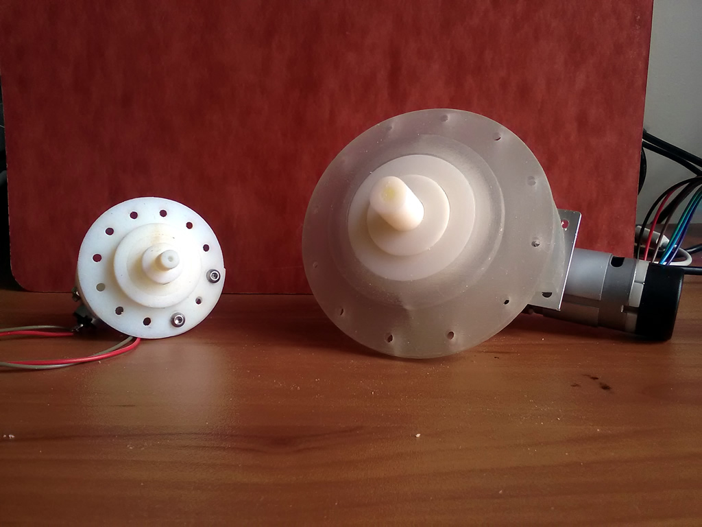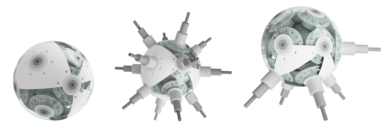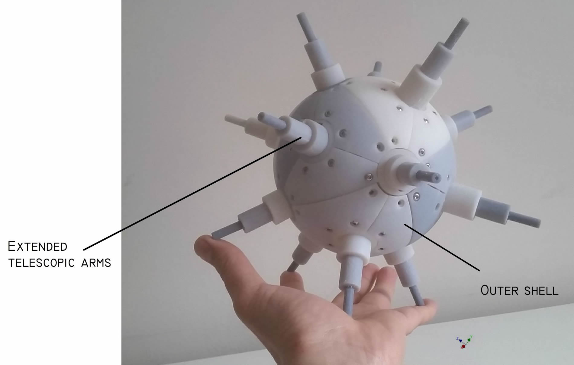Particle robot with telescopic actuators extended (left). 3D print actuator systems for particle robot D = 130mm diameter and particle robot D = 260mm diameter (right).