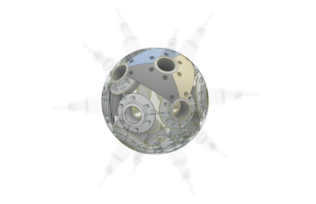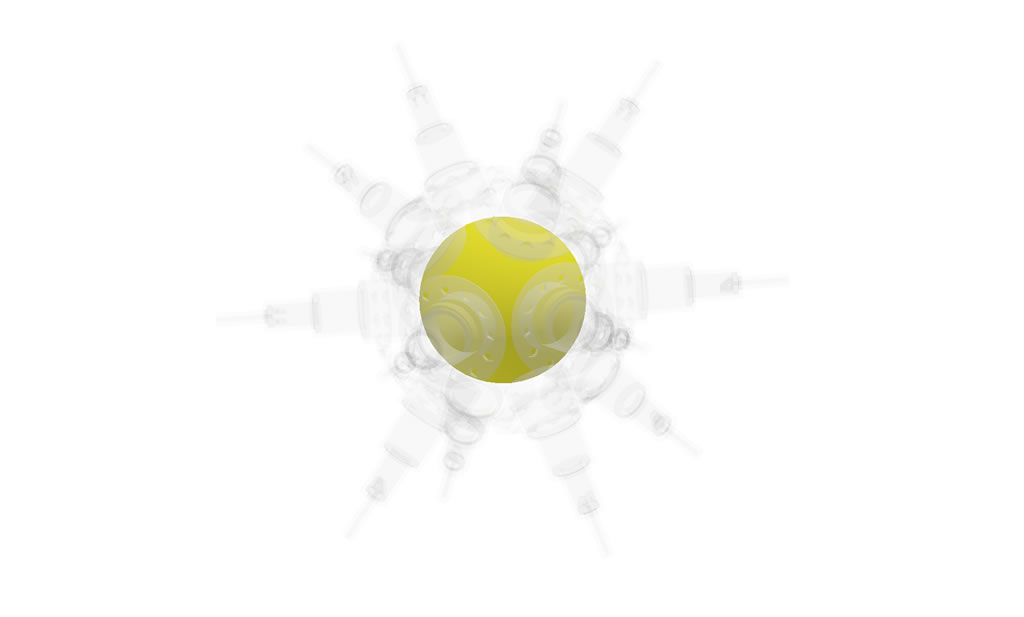 Particle robot 3D model with transparent outer shell, exposing the inner spherical mobile robot (left).