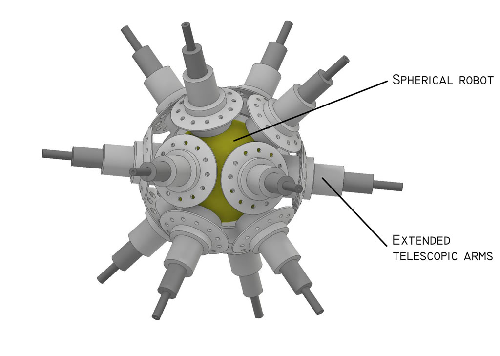 The design of the particle robot consists of three main parts: the inner shell or embedded spherical mobile robot, the outer shell or exoskeleton and the 14 telescopic actuators as the legs or spines of the robot: