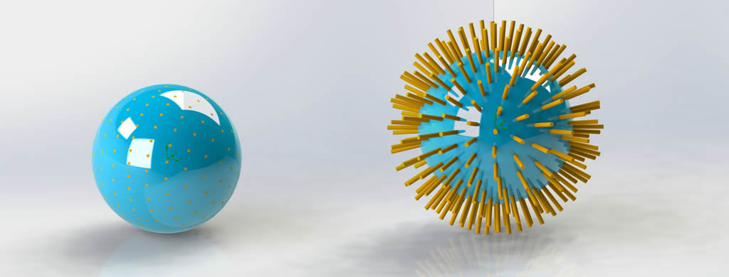 Virtual particle robot with spines commpressed inside the body (left). Extending its spines (right)