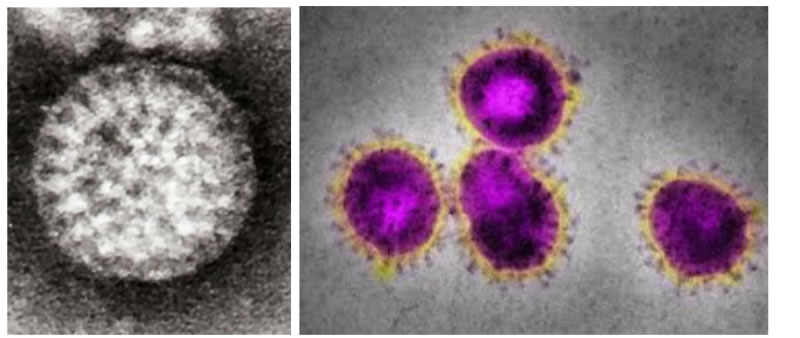 When examined by negative stained electron microscopy, rotaviruses often resemble wheels (left). Coronaviruses resembling spherical bodies with ”legs” (right).