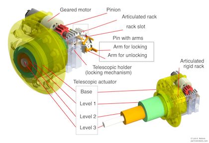 Telescopic actuators with articulated rack and pinion gearbox. Linear actuators generally offer low speed and small ratio between the total length when fully extended to the length when compressed. The reason is that in its body rest a rigid piston without the capability to be folded or bended.