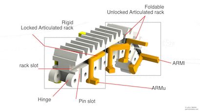 The challenge is to fold the rigid element to fit it inside the limited space in between the particle robot's outer and inner shells. So, when the robot compresses all its linear actuators, the robot can move as a spherical mobile robot. While, when extending them, the articulations are converted into rigid links mimicking a rigid piston able to lift the robot.