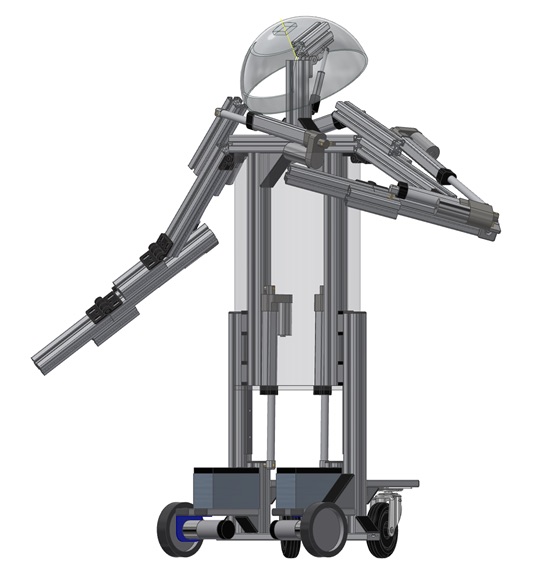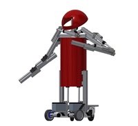 REDI humanoid robot integrates a head, a couple of arms and a torso attached to a mobile platform. The robot head is able to pan and tilt. The robotic arms integrate high torque motors enabling the robot to lift considerable heavy objects, such as chairs, sacks, etc. The body of the humanoid can contract, so the robot is able to pick objects from the ground and can extend to reach objects from tables or other furniture. The locomotion consists of a mobile robot in a differential wheel-drive configuration, that enables the robot to move around the house.