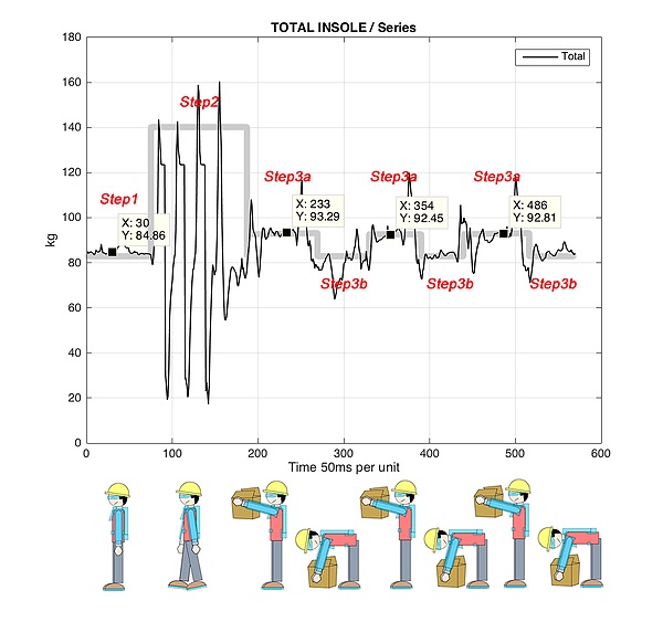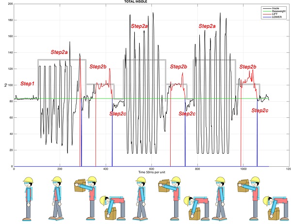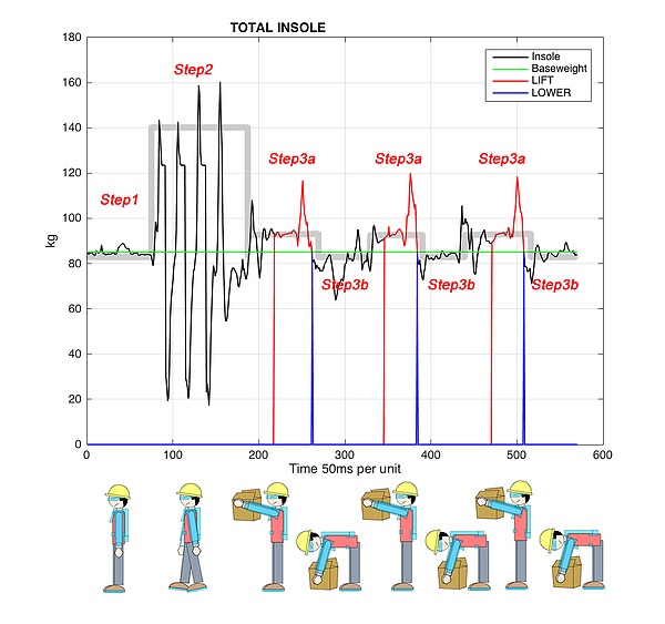 The results show that the proposed insole FSR system is able to detect the weight of a person and the lifted weight, by integrating force sensors located under the shoes of a person. The FSR insole system integrate 8 force sensors per foot, divided in two modules, one module located under the heel area and the other under the foot metatarsals. In this configuration, the FSR insole system is able to measure the forces between 0 to 160kg.