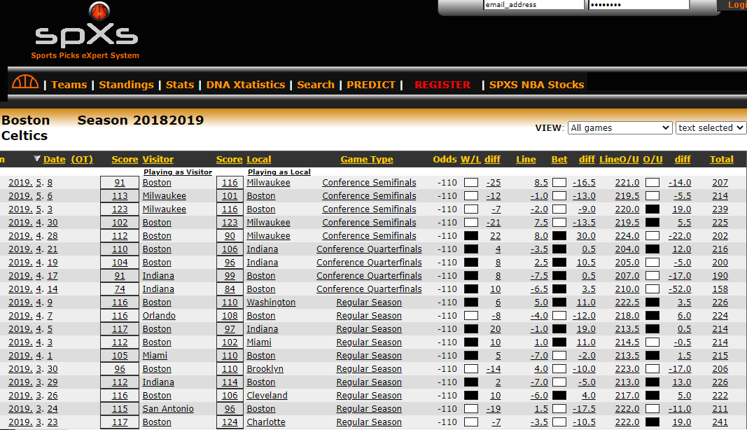 The SPXS - Sports Picks Expert System is used for implementing a combinatorial regression to identify underlying correlations between the betting variables in the dataset. The expert system analyzes the three main variables that results from a game match: W/L (win/lose) the game match; C/N (cover/no cover) the betting line (point spread); O/U (over/under) total points line (TPL) and their differences or error with respect to the casinos betting lines: delta w is the difference of points from the final score in a game match between two teams, delta c is the error in points with respect to the favorite team to win the game match (ATS) and delta o is the error in points with respect to the TPL.