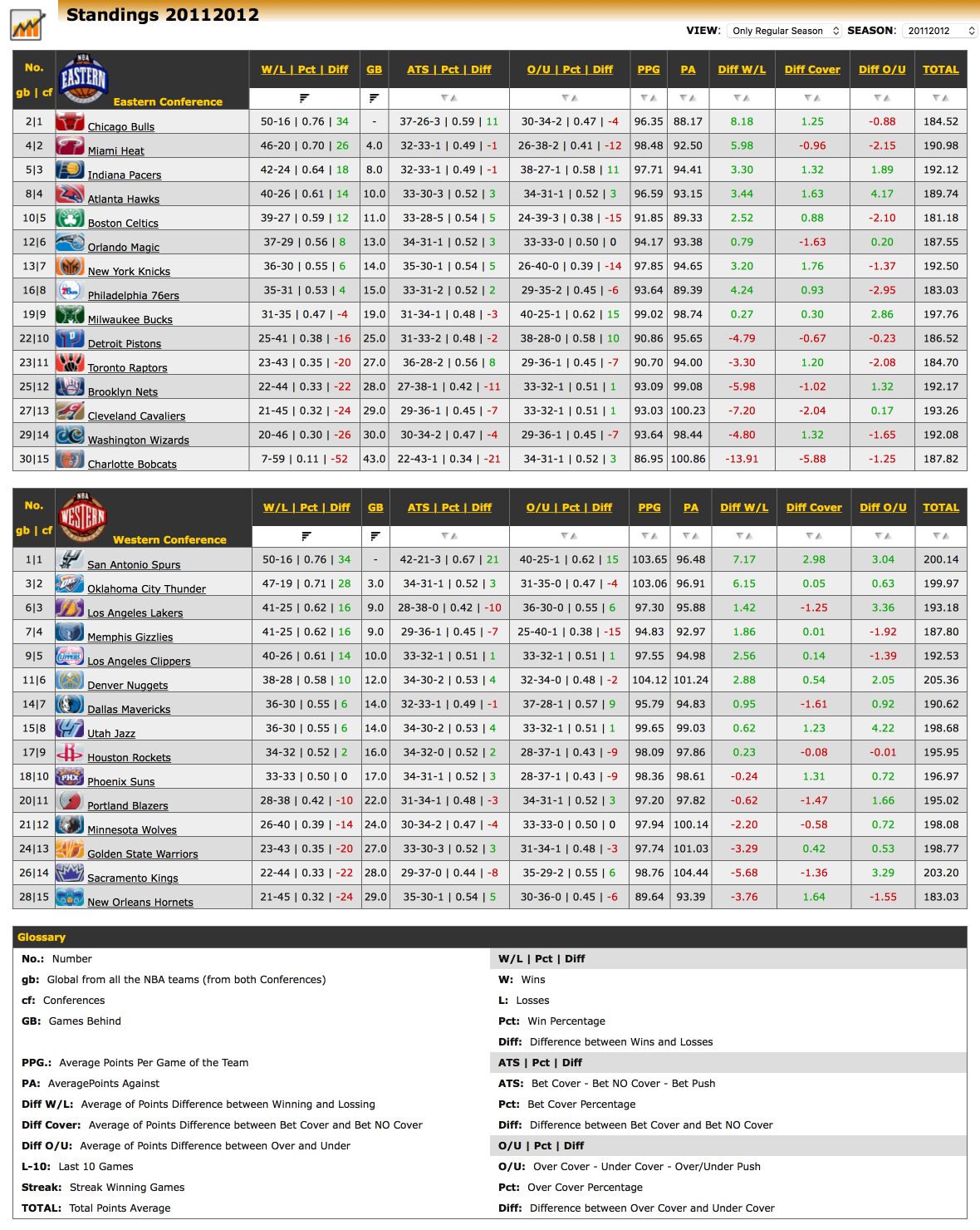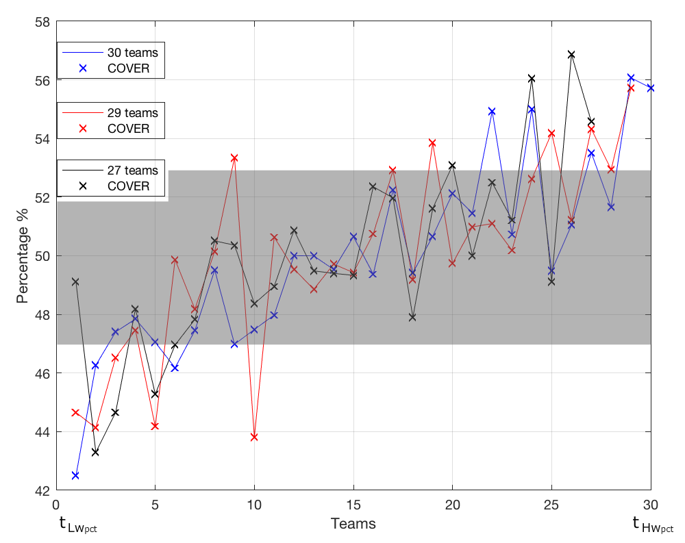 Betting variable cover the point spread, sorted by teams winning averages (1990-1991 to 1994-1995 season (27 teams); 1995-1996 to 2003-2004 season (29 teams); 2004-2005 to 2013-2014 season (30 teams). (Gray area is defined as the house edge of ±2:54%)