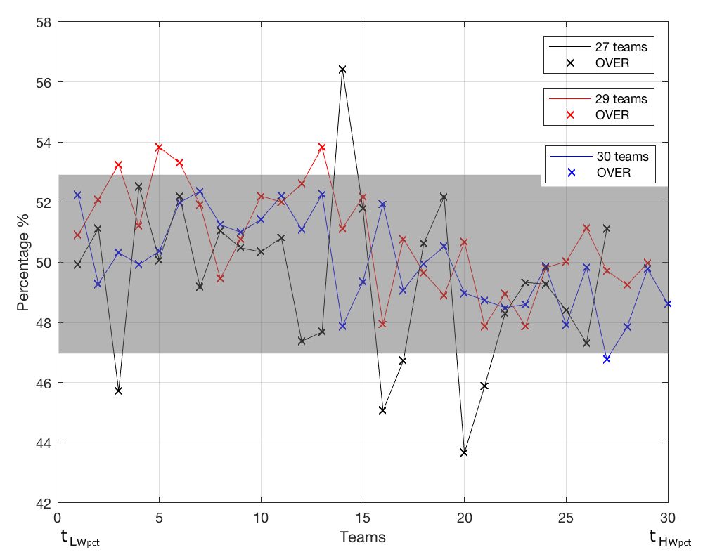 Betting variable over the total points line (TPL), sorted by teams winning averages (1990-1991 to 1994-1995 season (27 teams); 1995-1996 to 2003-2004 season (29 teams); 2004-2005 to 2013-2014 season (30 teams). (Gray area is defined as the house edge of ±2.54%)
