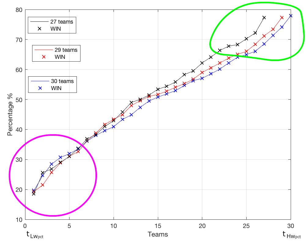 Teams winning percentages 1990- 1991 to 1994-1995 season (27 teams); 1995-1996 to 2003-2004 season (29 teams); 2004-2005 to 2013-2014 season (30 teams)